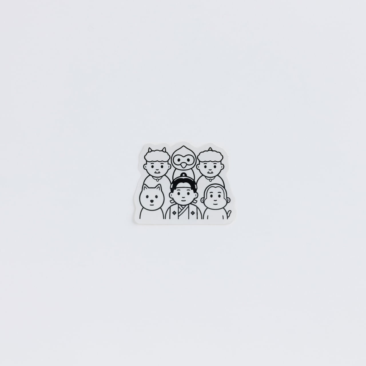 桃太郎と仲間たちが一人ずつデザインされたステッカーと、仲間たちが集合したステッカー。ノートやファイル、スマートフォンケースなど、お好きな場所に貼って、自分だけのオリジナルアイテムを彩りましょう。